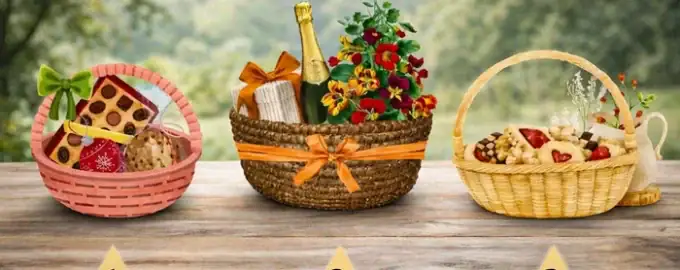 Stel je voor dat het vandaag je verjaardag is of een andere belangrijke feestdag. Bekijk de afbeeldingen van drie manden en bedenk welke je cadeau zou willen krijgen. Denk niet alleen aan de inhoud, maar ook aan de vorm en kleur van de mand zelf.