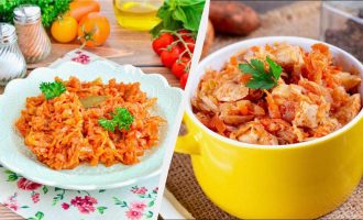 - Terwijl een deel van de groenten kookt, maak je een dressing van de andere groenten. Snijd de ui en de wortelen in blokjes. Bak ze 3 minuten in een pan met olie. Voeg geraspte bieten en tomatenpuree toe en bak nog eens 5 minuten. Doe het braadstuk en de vis in de tomaat in een pan. Kook alles samen ongeveer 5 minuten en zet het vuur uit.