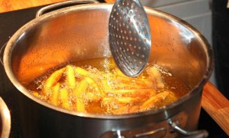 - De plantaardige olie moet heel heet zijn, maar mag niet roken. Als de vis in de hete olie komt, denatureert (stremt) het eiwit onmiddellijk, waardoor een ondoordringbare barrière ontstaat.