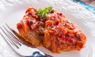 Leg dikke uienringen in een bakvorm, bestrooi met zout- en pepermengsel. Ontdooi en maak de munt van tevoren schoon, wrijf het in met zout en leg het op de uienkussentjes. Meng in een kom zure room, tomatenpuree, zout en pepermengsel. Smeer de vis in met de ontstane saus en zet hem in de oven. Vergeet ook niet hoe lang de koolvis in deze vorm bakt – je moet hem 45-60 minuten bakken op 200 graden Celsius. Voor het opdienen kun je het bestrooien met gehakte peterselie.