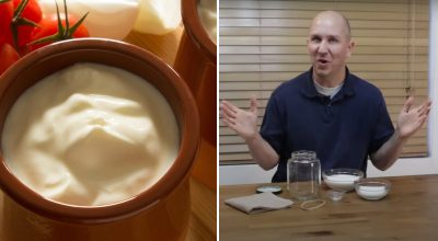 “Neem nu een schone doek en bedek de pot ermee. Maak het vast met een elastiekje, touw of iets dergelijks zodat het er niet af kan glijden. Laat de pot 24 uur op kamertemperatuur staan. Zodra het mengsel is ingedikt, verwijder je de doek. Je zult merken dat het dik is aan de bovenkant en een beetje waterig aan de onderkant – het is gelaagd. Dit is normaal. Neem gewoon een grote lepel en meng alles tot het glad is. Doe het dan over in een bakje. Je dikke zelfgemaakte zure room is klaar,” zei Matt.