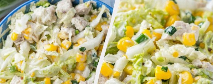 Makkelijke salade met kool, kip en maïs is gemakkelijk te bereiden.