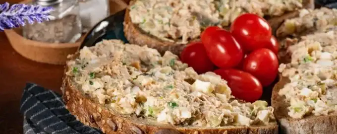 Een eenvoudige, smakelijke versie van een voorgerecht gemaakt van brood, vis uit blik en groenten.
