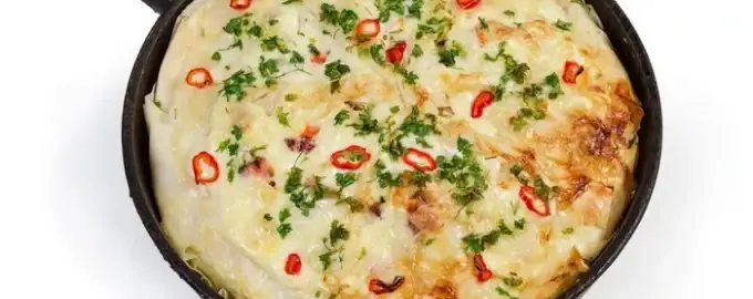 - Vet een koekenpan in met boter, verhit hem, leg het mengsel erin en verdeel het over het hele oppervlak, dek af met een deksel en bak 5 minuten, draai dan met behulp van een bord om naar de andere kant en bak nog eens 3 minuten.